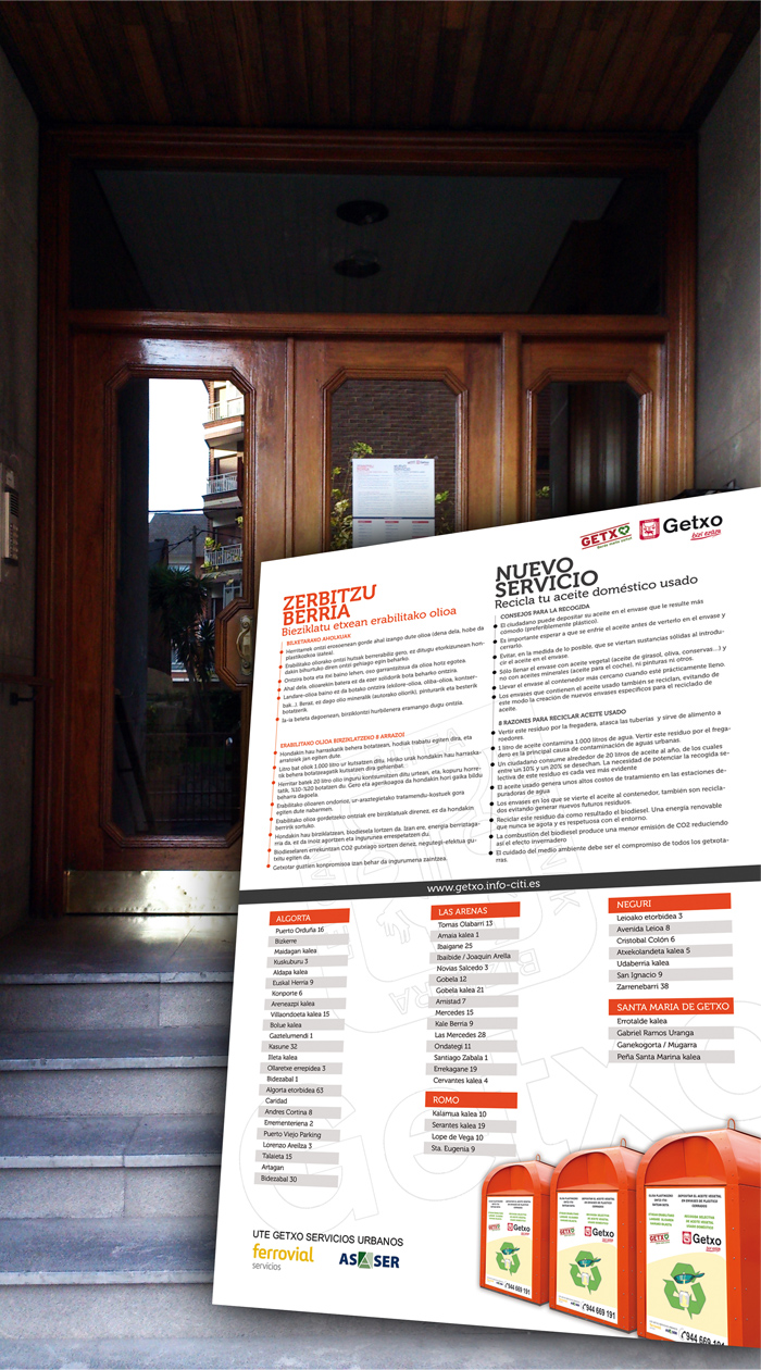 Al mismo tiempo que se instalaban los contenedores, los portales de Getxo se han convertido en el soporte de la nueva campaña informativa lanzada desde Rafrinor. 2.800 carteles, presentes en cada uno de los edificios del municipio, informan de las direcciones postales donde se localizan cada uno de estos contenedores naranjas.